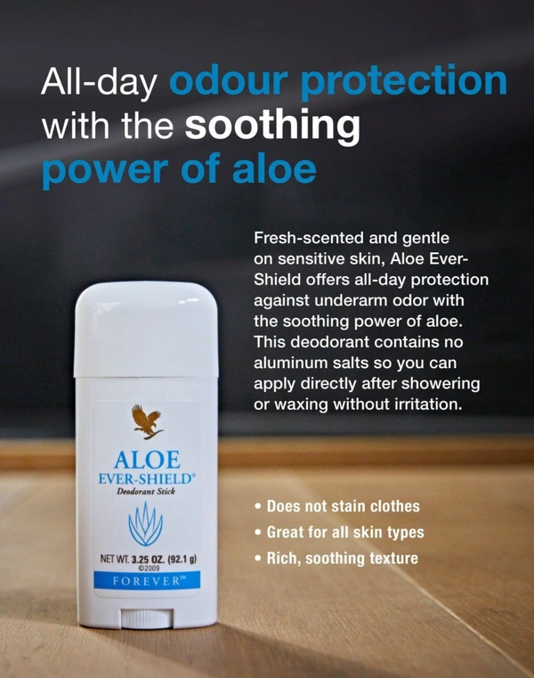 Introducing Aloe Ever-Shield�, your ultimate solution for all-day underarm freshness and comfort. Crafted with the soothing essence of aloe, this innovative formula provides unparalleled protection against odor without the use of harsh antiperspirants or aluminum salts. Say goodbye to irritation, even after showering or waxing, as Aloe Ever-Shield� delivers gentle care to your delicate underarm skin. Experience the natural goodness of aloe as it nourishes and revitalizes, leaving you feeling confident and refreshed throughout the day. With Aloe Ever-Shield�, you can embrace a healthier approach to underarm care without compromising on effectiveness. Trust in the power of aloe for long-lasting freshness and unparalleled comfort. Make the switch today and discover the difference for yourself.